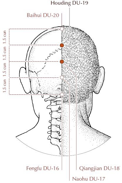 刺法:令患者正坐,雙腿下垂,與肩同寬,雙目平視,全身放鬆,意念專注,呼吸均匀。取1.5寸28號(0.35x40mm)毫針,自後頂穴進針向下刺向強間穴,用搓針導氣法,令患者做深呼吸,搓90~100次。