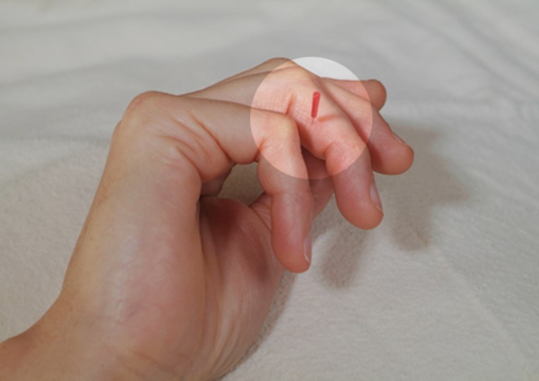 - 脾三叉,針要靠近第四掌骨,針前附近要揉一下,不用扎得很深,因為作用在脾,扎到脾位即可(肺→心→脾→肝、腎),最多扎到中間即可。肌肉酸痛都可用脾三叉。